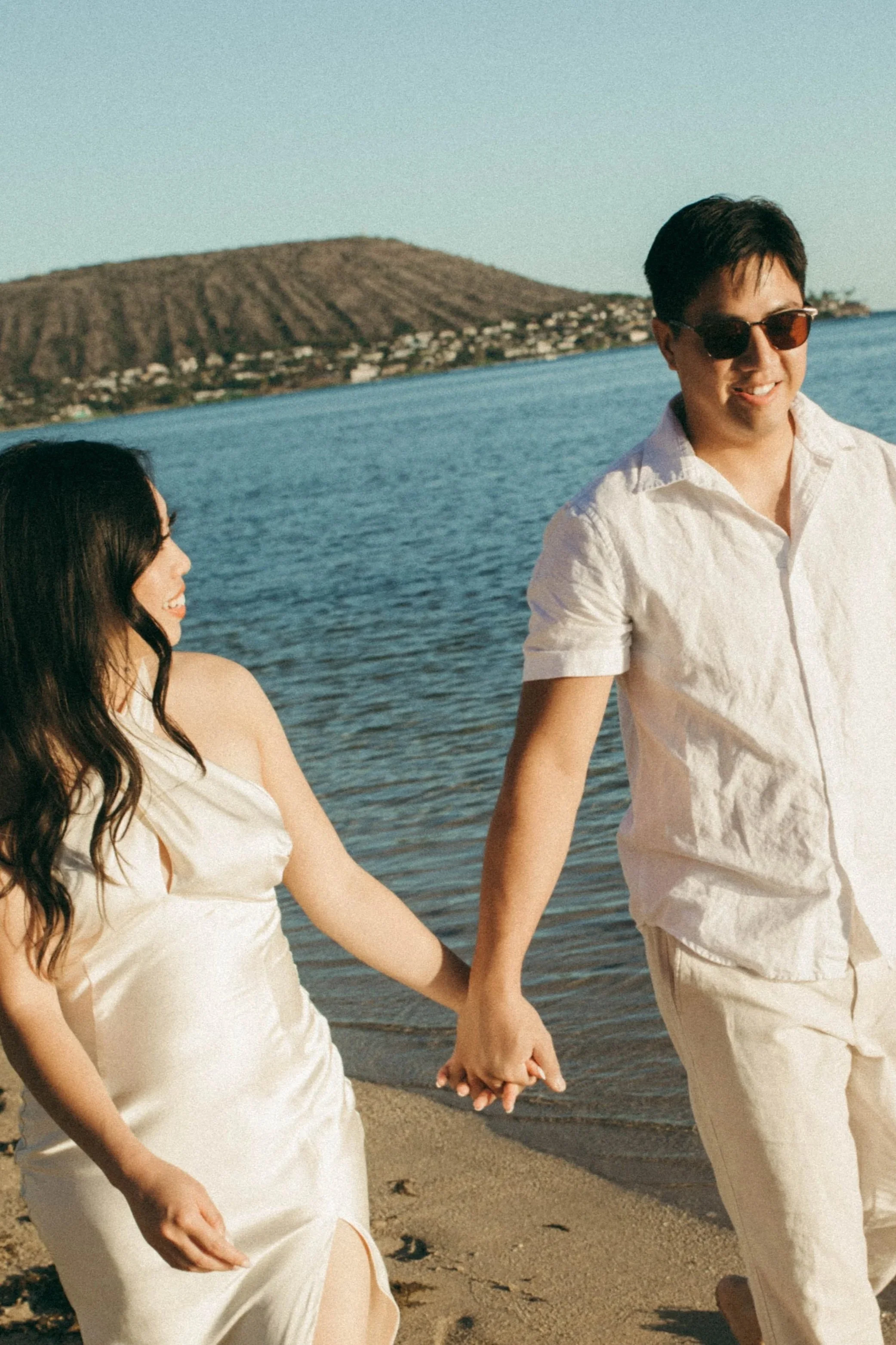Christine wore a white satin halter dress, and Kevin wore a linen shirt and pants for their beach photo session.